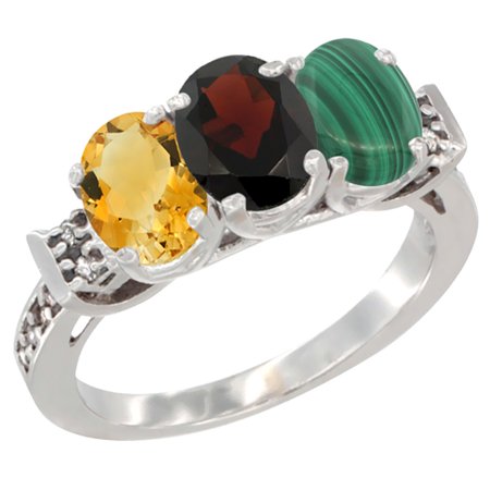 14K White Gold Natural Citrine, Garnet & Malachite Ring 3-Stone 7x5 mm Oval Diamond Accent, sizes 5 - 10