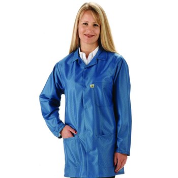 " Lab coats are made of durable EconoShieldâ„ ECX-500 fabric, which is conductive, non-flaking, and non-sloughing. The surface resistivity of the fabric is 106 ohms per square, while the static decay rate is 5000V to 500V in less than 0.1 seconds, providing excellent static shielding properties. Lab coats are mid-thigh length, with a lapel collar and three pockets. Lab coats are also available in white -contact your VWR sales representative for information."