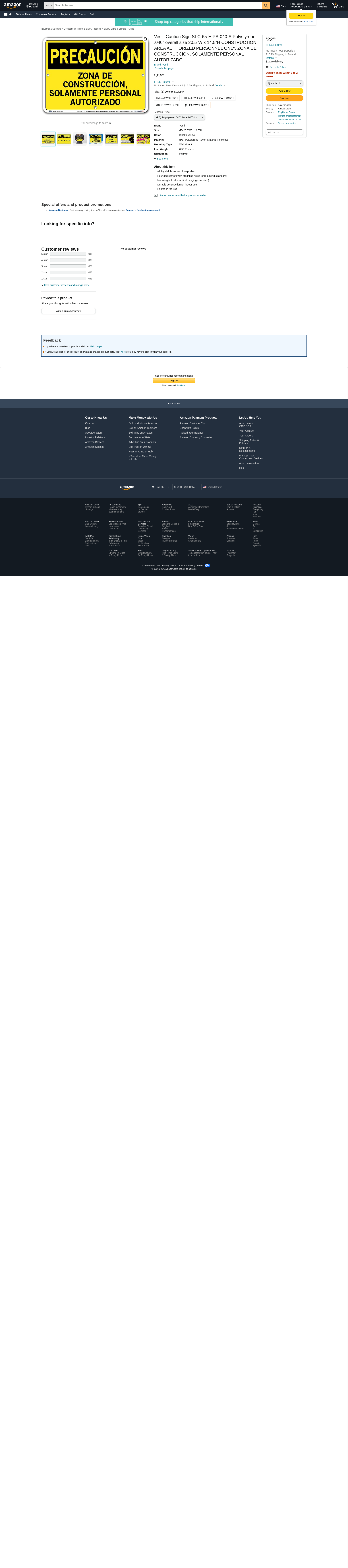 Vestil Caution Sign SI-C-65-E-PS-040-S Polystyrene .040" overall size 20.5"W x 14.5"H CONSTRUCTION AREA AUTHORIZED PERSONNEL ONLY, ZONA DE CONSTRUCCIÓN, SOLAMENTE PERSONAL AUTORIZADO