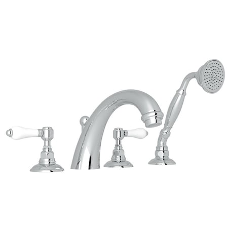 Rohl A2104LPAPC ROHL COUNTRY BATH SAN JULIO FOUR HOLE DECK MOUNTED TUB FILLER IN POLISHED CHROME WITH PORCELAIN LEVERS ^LE PIETRE^ SPOUT AND SINGLE FUNCTION BRASS HANDSPRAY C.B 4H DK FLR PRCL ^C^ P.CR