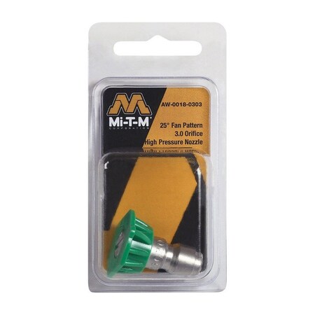 Sold as 4 UNITS at $7.19 per unit. (1 unit = each.) 3.0 orifice. 25 degrees. For general cleaning, quickly moves dirt and debris. Fan spray covers 5'-8' wide pattern. Green color-coded rubber finger grip. Fits JP2700 (SKU # 1085372) and WP2400 (SKU # 1188747) units. Carded . Manufacturer number: AW-0018-0303. SKU #: 1207240. Country of origin: (TBA). Distributed by Mi-T-M Corp.
