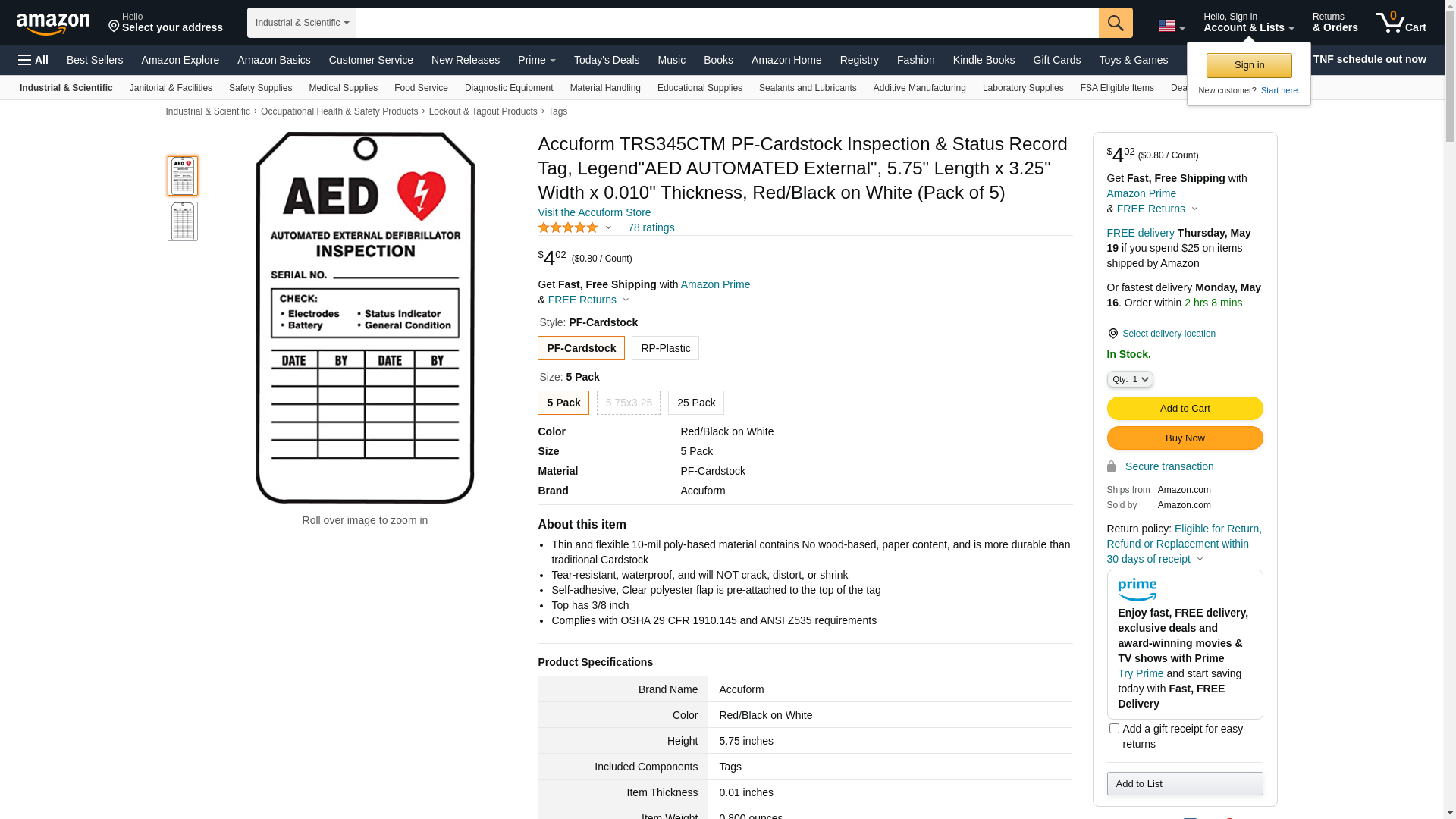 Order TRS345CTM by Accuform Safety Tag "Automatic External Defibrillator ..." - US Mega Store