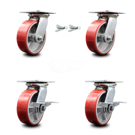Heavy Duty Large Top Plate Polyurethane on Cast Iron Swivel Caster Set of 4 w/6" x 2" Red Wheels-Includes 2 Swivel with Bolt on Swvl Lcks& 2 Swvl with Brakes-4800 lbs Total Cpty - Service Caster Brand