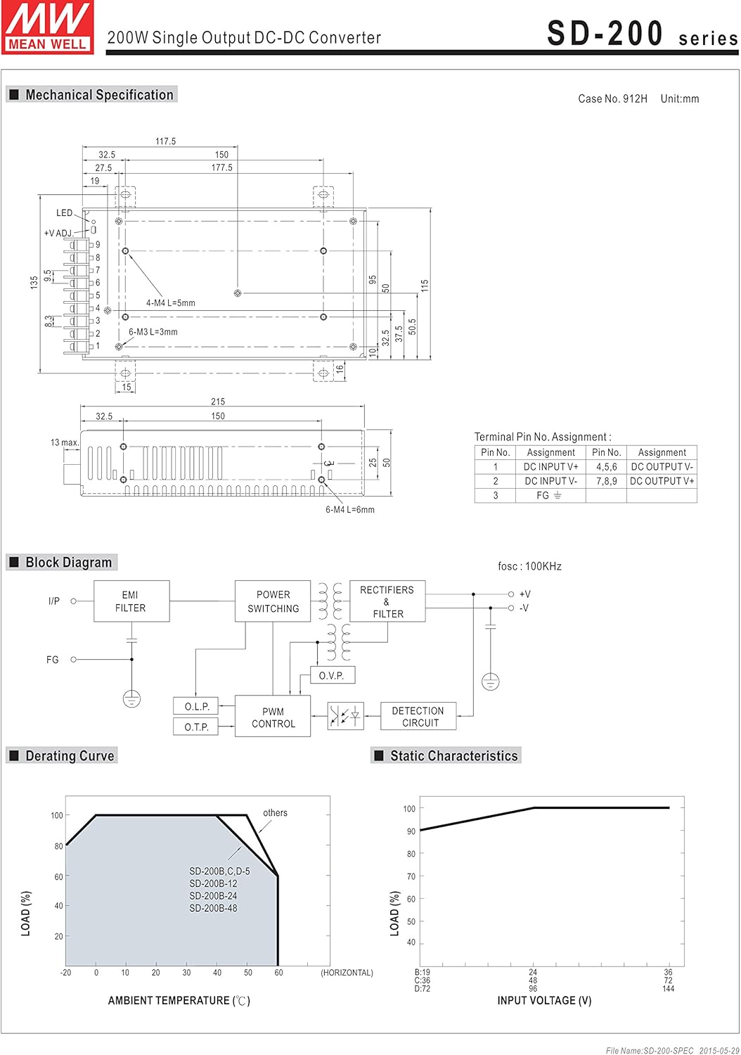 <p><b>Features:</b></p> <p>2:1 wide input range</p> <p>Protections:Short circuit / Overload / Over voltage / Over temperature</p> <p>1500VAC I/O isolation</p> <p>Cooling by free air convection</p> <p>100% full load burn-in test</p> <p>24V and 48V input voltage design refer to LVD</p> <p>2 years warranty</p> <p></p> <p><b>General Specification:</b></p> <p>AC input voltage range: B: 19~36VDC ;C: 36~72VDC ; D: 72~144VDC</p> <p>AC inrush current (Typ.): C: 45A~48VDC ;D: 45A~96VDC</p> <p>DC adjustment range: 5V: 4.5~5.5VDC, 12V: 11~16VDC ,24V: 23~30VDC ,48V: 43~53VDC</p> <p>Over voltage protection:5V: 5.75~6.75V, 12V: 16.8~20V ,24V: 31.5~37.5V ,48V: 53~65V, Protection type : Shut down o/p voltage, re-power on to recover</p> <p>Overload protection: 105~135% rated output power , Protection type: shut down o/p voltage , re-power on to recover</p> <p>Over temperature protection: Shut down o/p voltage, recovers automatically after temperature goes down</p> <p>Withstand voltage:I/P-O/P: 1.5KVAC ,I/P-F/G: 2KVAC ,O/P-F/G: 0.5KVAC</p> <p>Working temperature: -20~ +60ºC (Refer to "Derating Curve")</p> <p>Safety standards:UL60950-1 approved(for SD-200C-24 type only),IEC60950-1 CB approved by TUV(for D type only), EAC TP TC 004 approved</p> <p>EMC standards: Compliance to EN55032 (CISPR32) Class B, Compliance to EN61000-4-2,3,4,6,8, light industry level, criteria A ,EAC TP TC 020</p> <p>Isolation resistance:I/P-O/P,I/P-F/G,O/P-F/G: 100M Ohms/500VDC/25ºC/70% RH</p> <p>Dimension (LxWxH) (mm):215x 115x 50</p>
