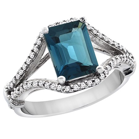 10K White Gold Natural London Blue Topaz Ring Octagon 8x6 mm with Diamond Accents, sizes 5 - 10