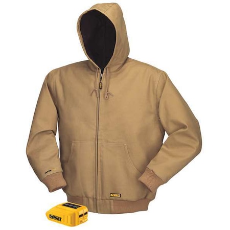 The DeWALT DCHJ064 Khaki Heated Jacket made of a durable water and wind resistant cotton outer shell. Includes reinforced cuff stitching and wind guard blocks wind from coming through zipper. Does not include 20V MAX lithium ion battery.