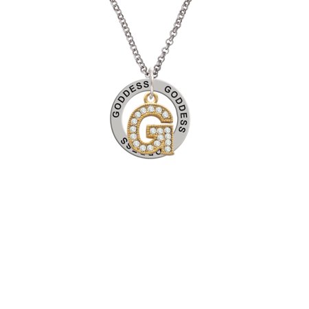 Gold Tone Crystal - G - Initial - Beaded Border Goddess Affirmation Ring Necklace. Gold Tone Charms. Charm size is approx. 0.69 x 0.5 x 0.11 inches (HxWxD) including loop. Silver tone 2mm Belcher Chain Necklace is approx. 23 Inches with a Lobster Claw Clasp. Affirmation Ring is approx. 0.86 x 0.86 x 0.05 (HxWxD). This inspirational piece of jewelry is very meaningful. Its circular shape is symbolic for endless belief in the message that is imprinted around the ring. These are motivational or sentimental messages to the wearer. Makes a great team gift! PLEASE NOTE: Our products are lead safe, but are not intended for children 14 years and younger.