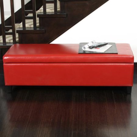 <ul> <li>Constructed from durable hardwood upholstered in red bonded leather on darkly stained wood legs</li> <li>Ample storage space useful for keeping your space neat</li> <li>Easy to clean leather upholstery</li> <li>Dimensions measure 16" H x 51" W x 19.25" D</li> </ul>