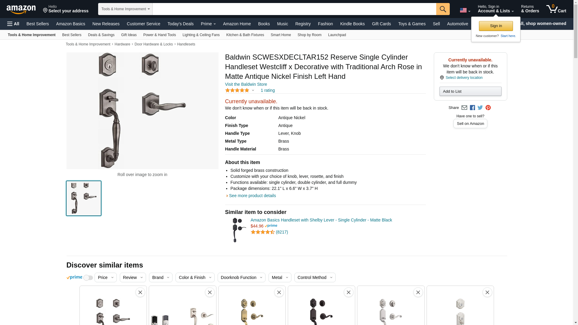 Baldwin SCWESXDECLTAR152 Reserve Single Cylinder Handleset Westcliff x Decorative with Traditional Arch Rose in Matte Antique Nickel Finish Left Hand