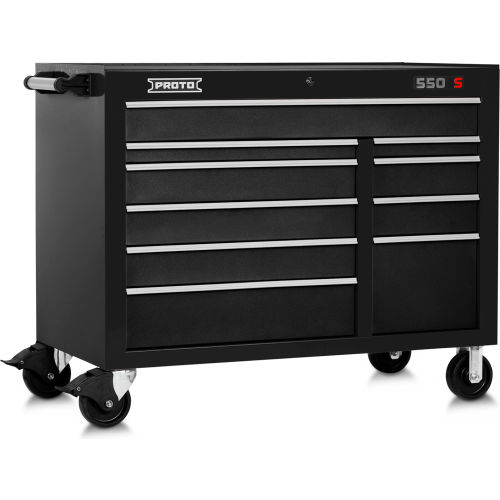 Technical Specification Item Workstation Series 550S Width 50" Depth 25-1/4" Height 41" Number of Drawers 10 Color Black Drawer Capacity 250 lb. Drawer Slides Ball Bearing, Full Extension Storage Capacity 23, 105 cu in. Load Rating 3600 lb. Caster Size 6" x 2" Number of Shelves 0 Material Steel Gauge Bottom: 14, Side: 16, Drawers: 18 Work Surface Material Steel/Vinyl Caster Wheel Material Glass Filled Nylon Caster Type (2) Fixed with Lock, (2) Swivel Locking System Heavy Duty Locks with Tubular Keys Handles Ergonomic Metal Side Configuration Center Bank: (1) 44-7/16" W x 23" D x 4" H, Left Bank: (1) 28" W x 23" D x 1-3/4" H, (3) 28" W x 23" D x 4" H, (1) 28" W x 23" D x 6-7/16" H, Left Bank: (1) 13-7/16" W x 23" D x 1-3/4" H, (2) 13-7/16" W x 23" D x 4" H, (1) 13-7/16" W x 23" D x 11" H Finish Gloss/Matte Features Brushed Aluminum Drawer Pulls, Fully Extending and Recessed Drawers, Adjustable Drawer Detents, Reinforced Top and Bottom Panels For Use With Proto 550 Series Includes Drawer Liners This listing is for each.