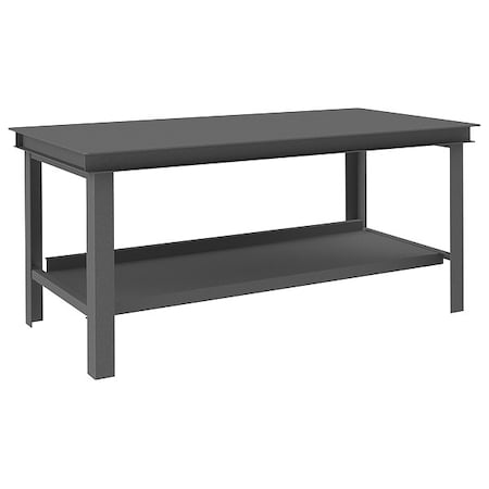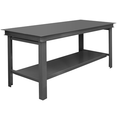 Built to withstand the toughest jobs, these extra-strong all-welded DURHAM 14,000-Lb. Capacity Workbenches will hold your heaviest industrial supplies. -1/4" steel plate top is welded to 3" C-channel frame. 3x3", -3/16" thick angle iron legs offer increased strength and rigidity. Store extra supplies on the 12-ga., 27-1/2"D lower shelf with 2-1/2" backstop. Powder coat texturized paint finish. All welded. Appropriate for lean manufacturing.