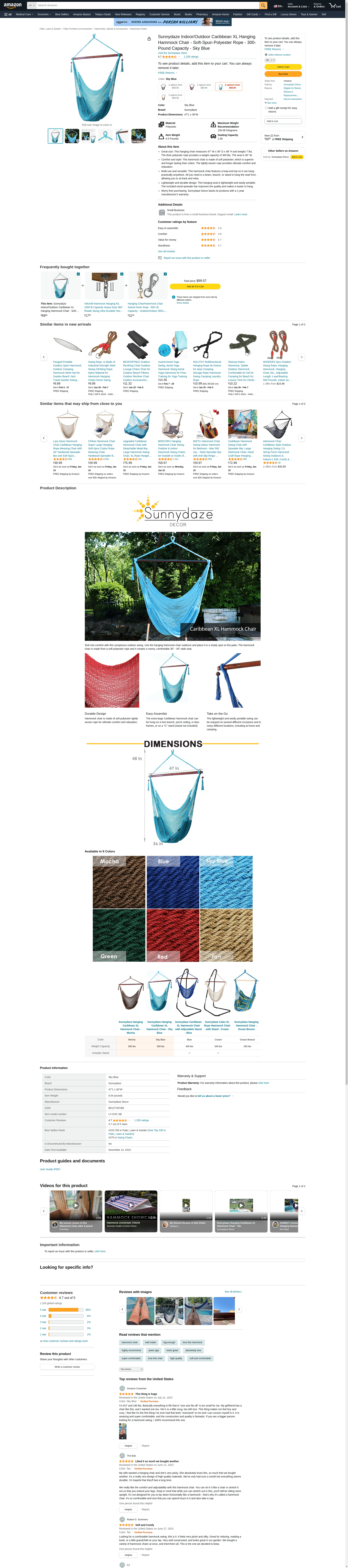- Great size: This hanging chair measures 47" W x 36" D x 48" H and weighs 7 lbs. The thick polyester rope provides a weight capacity of 300 lbs. The seat is 40" W.