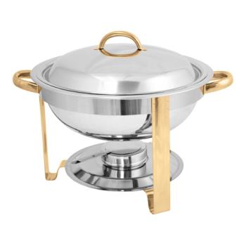 - Chafer, 4 quart, round, lift-off cover, fuel holder, gold accents, stainless steel