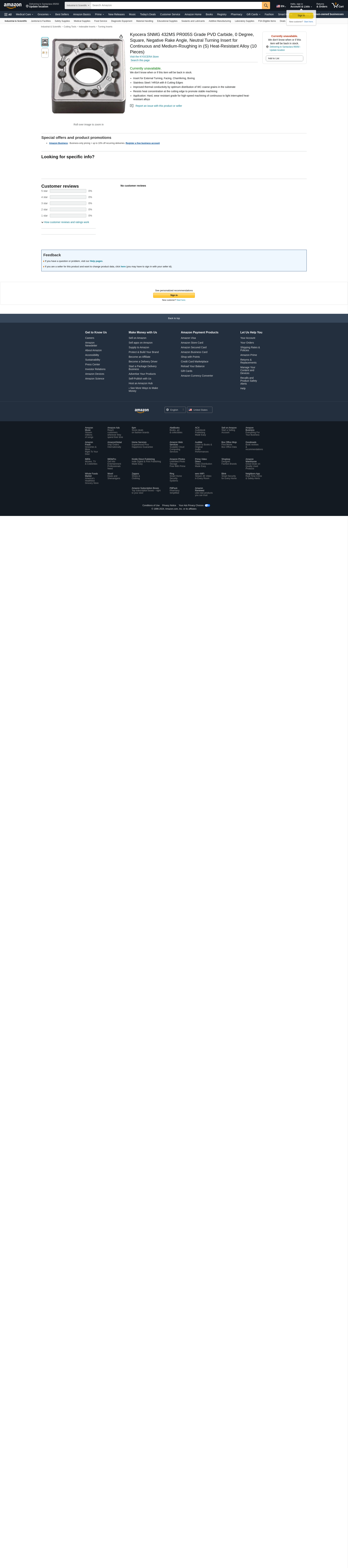 Kyocera SNMG 432MS PR005S Grade PVD Carbide, 0 Degree, Square, Negative Rake Angle, Neutral Turning Insert for Continuous and Medium-Roughing in (S) Heat-Resistant Alloy (10 Pieces)