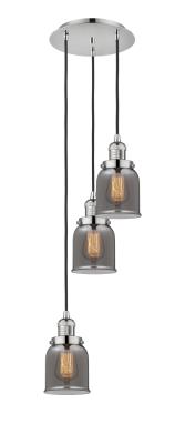 INNOVATIONS 113F-3P-PN-G53 Cone 3 Light Multi-Pendant part of the Franklin Restoration Collection Polished Nickel. Style: Traditional, Art Deco. Collection Name: Franklin Restoration. Metal Finish(Body): Polished Nickel. Metal Finish(Canopy/Backplate): Polished Nickel. Material: Steel, Cast Brass, Glass. Dimension(in): 36(H) x 11(W) x 11(Dia). Bulb: (3)60W Medium Base Incandescent(Not Included). Min/Max Height(Fixture Height with Shade,Cord or Included Stems & Canopy): 18/128. Voltage: 120. Dimmable: Yes. Color Temperature (Kelvin): 2200. Color Rendering Index (CRI): 99.9. Lumens: 220. Life Expectancy (Hours): 2000. Glass Shade Description: Plated Smoke Small Bell. Glass Type: Colorful . Shade Shape: Bell/Urn. Glass or Metal Shade Color: Plated Smoke. Shade Material: Glass. Shade Dimension(in): 5(W) x 5.75(H). Fitter Measurement (Glass Or Metal Shade Fitter Size): 3.25 inch Fitter. Canopy Dimension(in): 0.75(H) x 10(Dia). Sloped Ceiling Compatible: Yes. California Proposition 65 Warning Required: Yes. UL/ETL Certification Type: Damp Location.