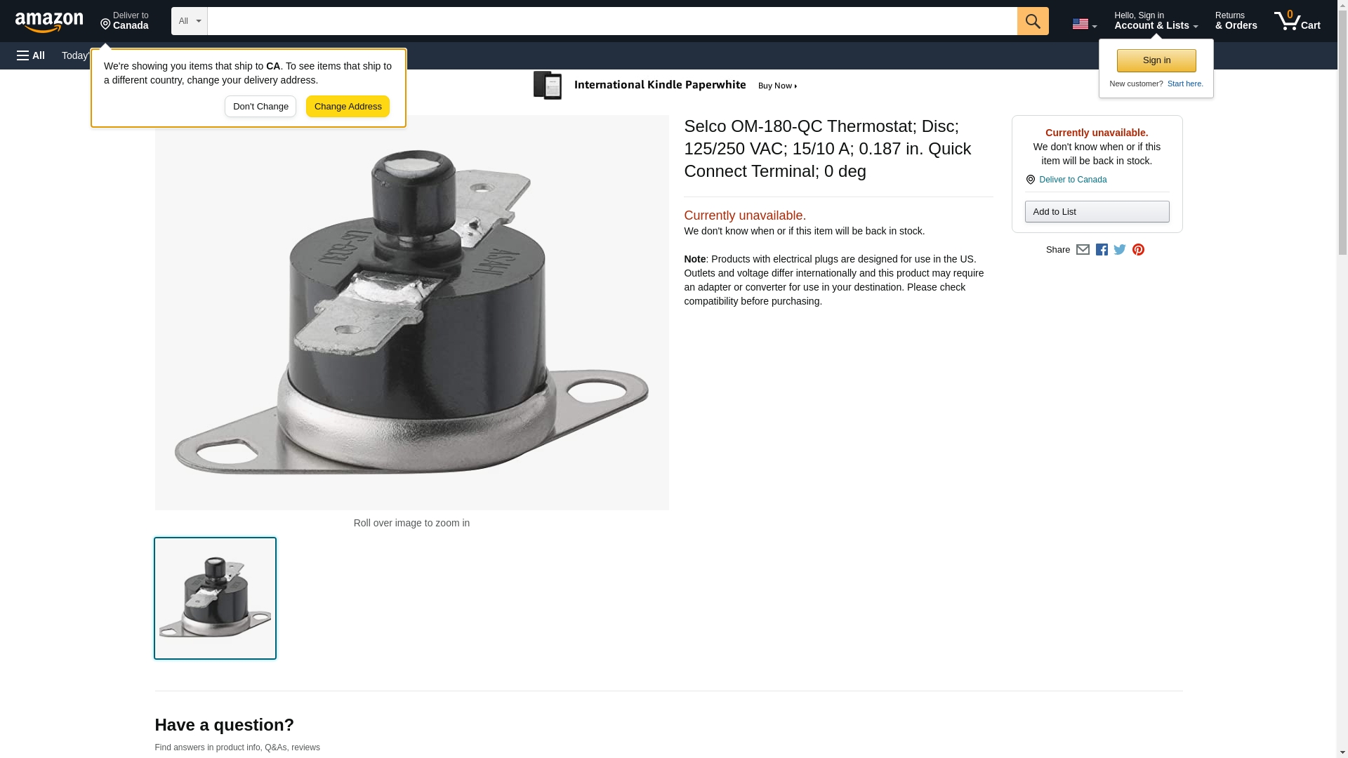 Selco OM-180-QC Thermostat; Disc; 125/250 VAC; 15/10 A; 0.187 in. Quick Connect Terminal; 0 deg