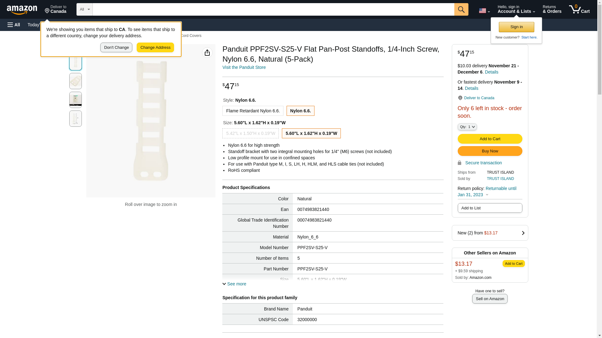 | Feature | <b>Price For:</b> Pack of 5 <b>Manufacturer</b>: Panduit <b>Product Category</b>: Cable Mounting & Accessories <b>RoHS</b>: <b>Brand</b>: Panduit <b>Type</b>: Flat Pan-Post Standoff <b>Material</b>: Nylon <b>Color</b>: Natural <b>Mounting Method</b>: 1/4 in (M6) Screw <b>Height</b>: 41.3 mm <b>Length</b>: 142.2 mm <b>Maximum Bundle Diameter</b>: 19.1 mm <b>Unit Weight</b>: 2.880000 oz |