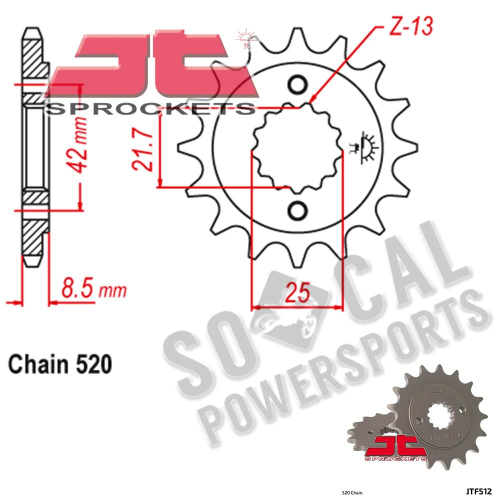 JT Sprockets Countershaft Sprocket<br/>Contains: One Steel Sprocket<br/>Location: Front<br/>Size: 15 Tooth<br/>Type: 520 Pitch<br/><br>* Actual Contents May Vary from Photo<br/><br>* Verify Coutershaft / Rear Hub Measurements Prior To Ordering, Due To Same Year Model Variances<br/><br/><br>     Vehicle fitment is based soley on Countershaft/Hub fit.<br/><br>     Before ordering verify crankcase, swing-arm or pertaining chain clearance<br/><br>     Nuts, Bolts, and locks are not included<br><br><br>-Made by JT Sprockets, world leading aftermarket sprocket manufacturer for over 30 years. JT Sprockets offer an unbeatable combination of quality, durability, and price. JT Drive sprockets are exclusively made from the finest Japanese ultra-durable high carbon C49 Steel or SCM415 Chromoly Steel Alloy.<br>-Fully heat treated for higher wear resistance<br>-Meet or exceed Japanese OEM standards<br>-Optimum design for light weight and strength