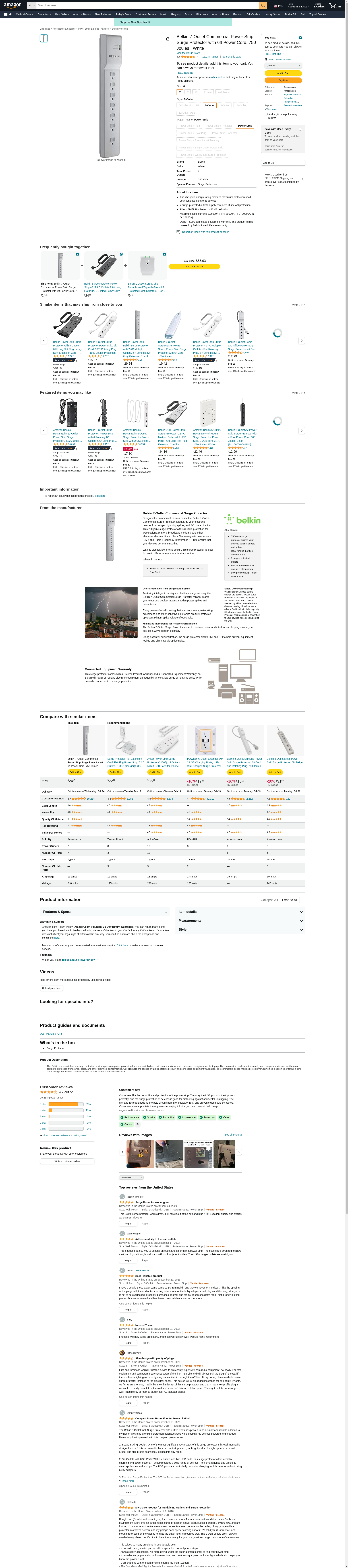 Belkin 7-Outlet Commercial Power Strip Surge Protector with 6ft Power Cord, 750 Joules , White