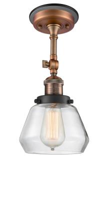 INNOVATIONS LIGHTING 201FBP-ACBK-G172 Fulton 1 Light Semi-Flush Mount. The Fulton 1 Light Semi-Flush Mount is part of the Franklin Restoration Collection. Solid Brass 180 Degree Adjustable Swivel with internal teeth that lock in at 5 degree intervals With Engraved Cast Cup. Collection: Franklin Restoration. Material: Steel, Cast Brass, Glass. Metal Finish(Body): Antique Copper. Metal Finish (Canopy/Backplate): Antique Copper. Metal Finish (Oversized BP-5 Backplate): Matte Black. Accent Color: Matte Black. Dimension(in): 12.5(H) x 7(W) x 7(Dia). Sloped Ceiling Compatible: Yes. Maximum Wattage Per Socket: 100. Bulb: (1)60W Medium Base(Not Included). Dimmable: Yes. Lumens: 220. Color Rendering Index(CRI): 99.9. Voltage: 120. Glass Shade Description: Clear Fulton. Glass Type: Transparent. Glass or Metal Shade Shape: Cone. Glass or Metal Shade Color: Clear. Shade Material: Glass. Shade Size (Diameter x Height)(in): 6.75 X 5.25. Shade Fitter Measurement(in): 3.25 inch Fitter. Canopy Dimensions(in): 5.5. Duo Mount: Yes. Certification: UL & ETL, Damp Location. Includes an optional 5.5 inch diameter canopy plate that adds an accent finish and can help cover miscut sheetrock.