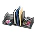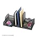 Organizer helps you effectively use desktop space. Features three vertical sections that hold file folders and binders. Two slide-out baskets hold small desktop items. Sliding shelves are ideal for small electronics or accessories. Durable steel mesh construction.