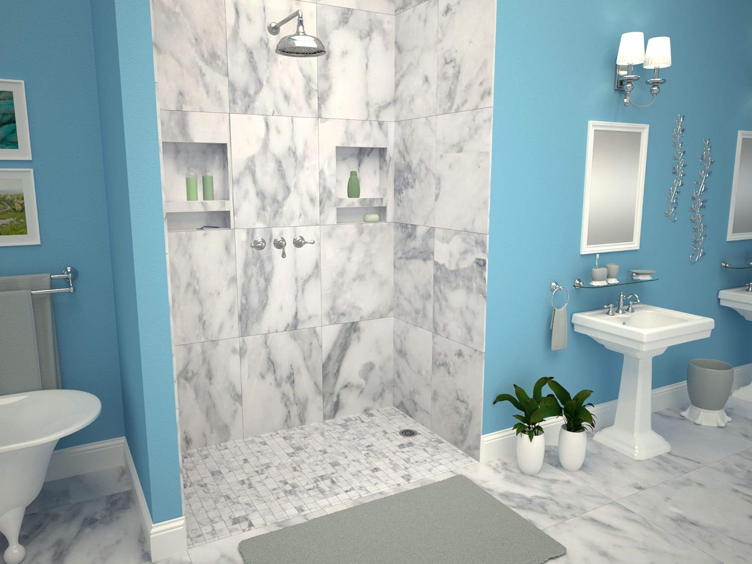 - ALL-IN-ONE SHOWER SOLUTION: One-piece, leak-proof, pre-pitched shower pan with integrated splash walls