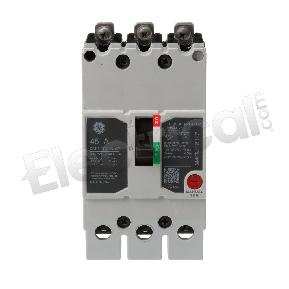 TEY-frame GE molded case circuit breakers are rated up to 125A and interrupt excessive current flows to protect devices from electrical damage. They're typically used with GE light panels, motor control centers, and panelboards. Their current-carrying parts, mechanisms, and trip devices are contained in a molded case. This listing is for each. MOLDED CASE, THERMAL MAGNETIC TYPE; 3 INCH W X 3-1/16 INCH D X 5-1/4 INCH H SIZE; 480 STAR/277 V MAX. AC VOLTAGE RATING; UL, CUL APPROVAL; 480 STAR/277 VAC VOLTAGE RATING; 65 KILOAMPERE AT 120/240 VAC, 35 KILOAMPERE AT 480 STAR/277 VAC INTERRUPTING RATING; 45 AMPERE CURRENT RATING; 3 POLE(S); BOLT-ON, COPPER/ALUMINUM LOAD LUG TERMINAL TYPE; TEYH FRAME TYPE; WIRE SIZE 10 TO 4 AWG (COPPER/ALUMINUM); TEYH MODEL