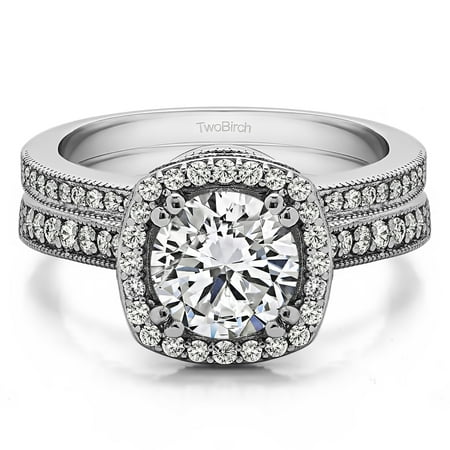 <ul> <li>Engagement Ring sets are made to fit together perfectly.</li> <li>The ring is set with 1.99 carats of round stones Cubic Zirconia</li> <li>This ring is available in 10K Gold, 14k Gold and sterling Silver. Click TwoBirch above to see it in all of its variations.</li> </ul>