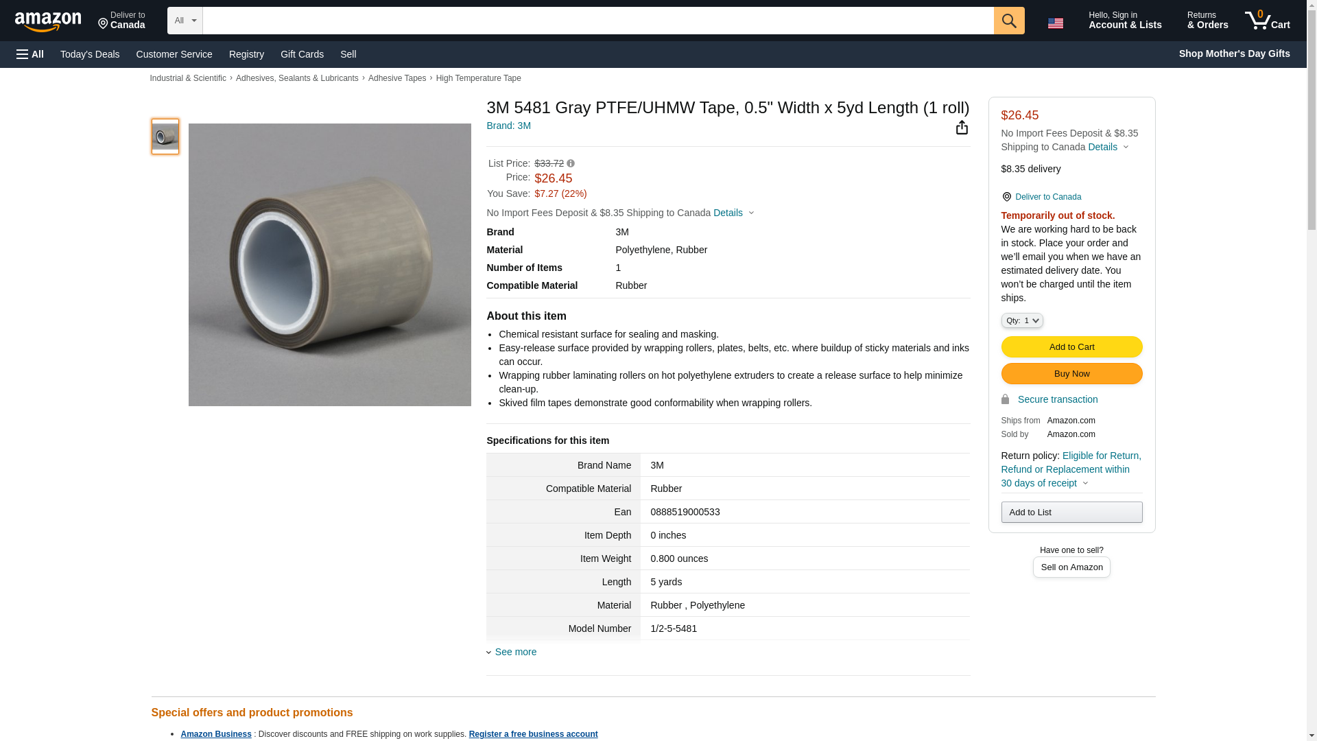 3M 5481 Gray PTFE/UHMW Tape, 0.5" Width x 5yd Length (1 roll)