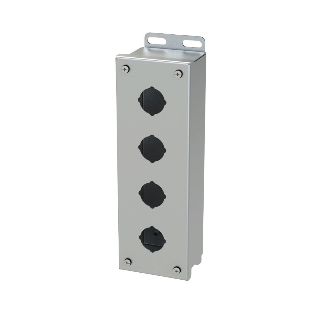 10.25 in X 3.25 in X 2.75 in Stainless Steel 30.5 mm Pushbutton Enclosure – SCE-4PBSS Application – These Stainless Steel 30.5 mm Pushbutton Enclosures from Saginaw are designed to house standard pushbuttons, switches and pilot lights in wet and hosed down areas and in corrosive atmospheres. For installation information, consult our Installation Manual at Saginaw Control.