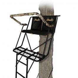 - <b>INNOVATIVE DESIGN </b>- This durable steel hunting tree stand features innovative design that includes a fully padded shooting rail that flips up and out of the way and a wide stance foot platform measuring 38" wide x 12" deep