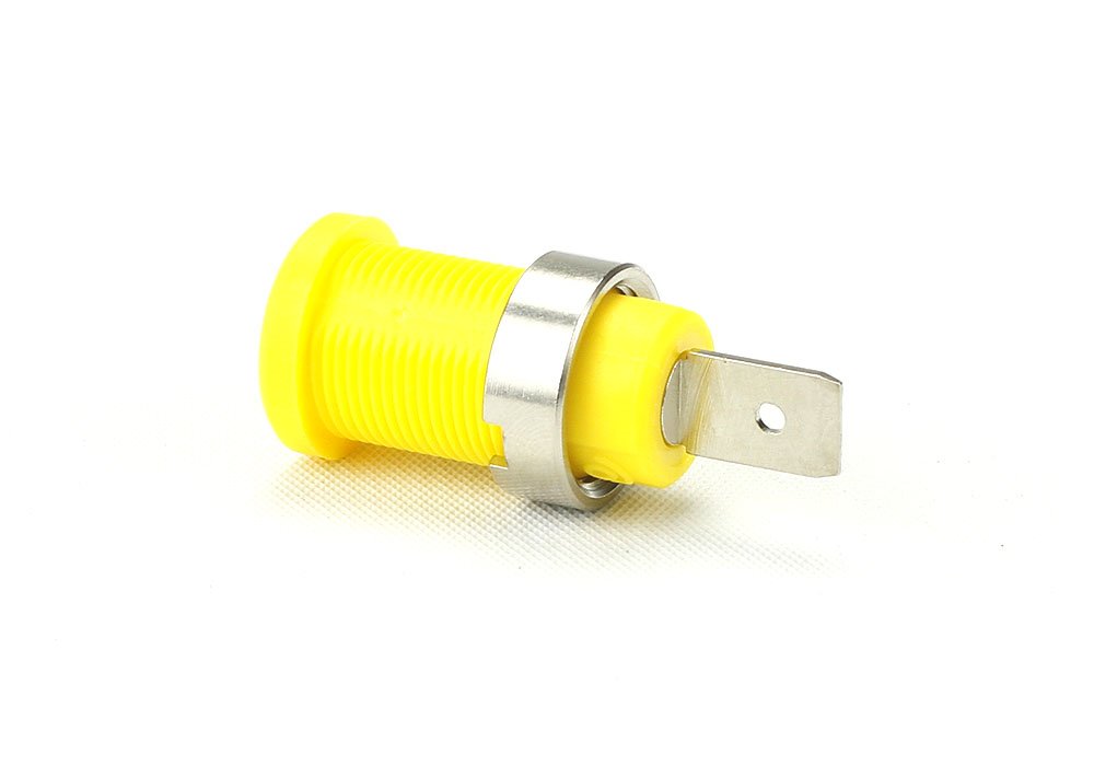 The 4mm safety banana jack (socket) accepts sheathed or shrouded banana plugs and meets the latest international safety standard IEC 61010-031 to 1,000 V CAT III. Round panel nut allows for compact placement and assembly. Termination is with 0.25" Faston terminal for quick assembly. Body made of polyamide (nylon); brass/nickel plated jack and nut. Body thread: M12 x 0.75mm. Maximum panel thickness: 0.40". Use assembly wrench tool set. IEC rating: 1,000 V CAT III / 600 V CAT IV. Current max: 36 A. Resistance max: <12 mohm. Temperature: -20 degree to +80 degree C. RoHS (2002/95/EC) compliant. Yellow color.