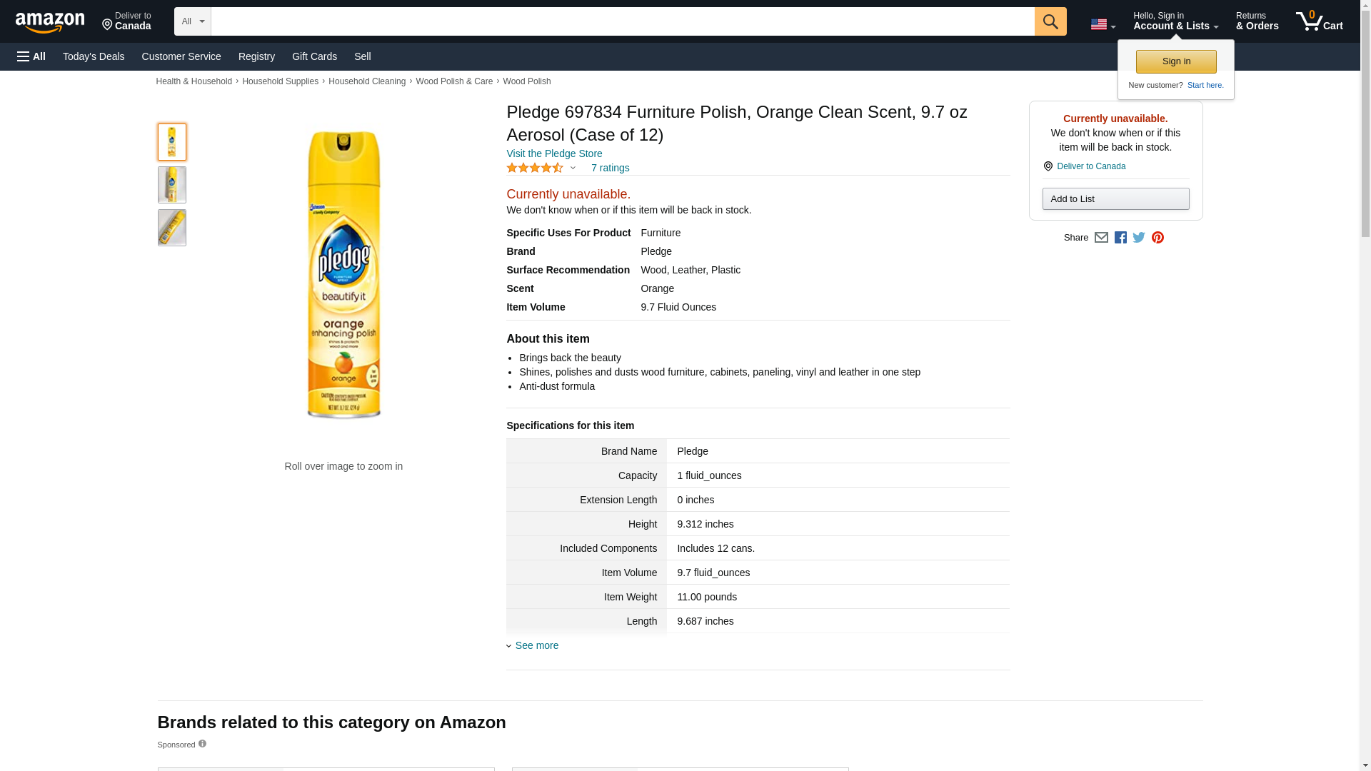 Pledge 697834 Furniture Polish, Orange Clean Scent, 9.7 oz Aerosol (Case of 12)