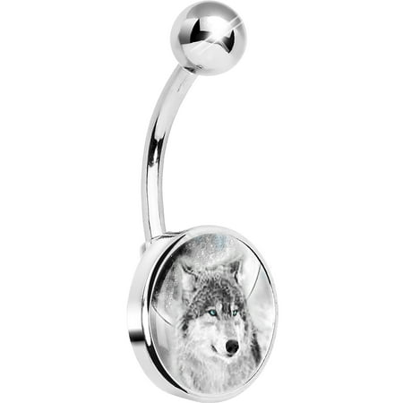 Blazing Blue Eyed Night Wolf Belly RingAnimal wolf belly ring with blazing blue eyes and a classic black and white design. Wolf body jewelry. stainless steel belly ring with a flat logo inlay. Specifications: 14 Gauge (1.6mm), 7/16" (11mm), 316L Stainless Steel, 5mm Ball, Hand Assembled in the USA