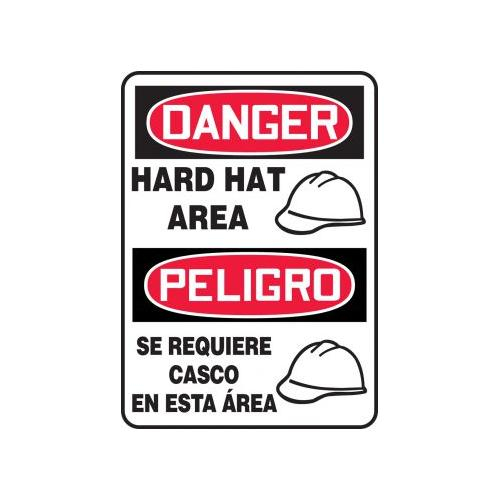 Bilingual OSHA DANGER Signs (English & Spanish) - Hard Hat Area (Graphic), 20" x 14". Adhesive Vinyl is a moisture-resistant custom sign and label material that adheres to almost any flat surface. Adhesive vinyl signs will work for short term outdoor applications in moderate temperatures. (For more extreme applications, choose Adhesive Dura-Vinyl instead.) Adhesive Vinyl is an excellent economical choice for self-stick applications. <br><br>Flexible vinyl with acrylic adhesive is Moisture resistant and has a non-glare surface. <br>Service temperature range is -40 to 176F.