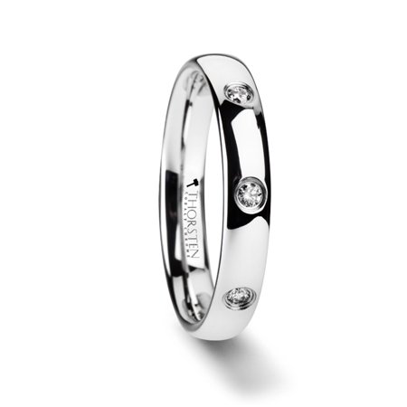 <p> This timeless classic 4 mm wide ring from our white tungsten collection is the perfect blend of elegance and durability for a woman. The band is made in the traditional domed design and has 3 round cut white diamonds with a total weight of 0.1 carat. The ring is polished to a mirror like shine, stone color is G, and clarity is SI2. The 3 diamonds are used to symbolize the past, present, and future of a couple's love.</p> <p><b>Truly Free Lifetime Sizing and Lifetime Warranty on all tungsten rings, no exchange/sizing fees, which are charged by other retailers. </b></p> <br />