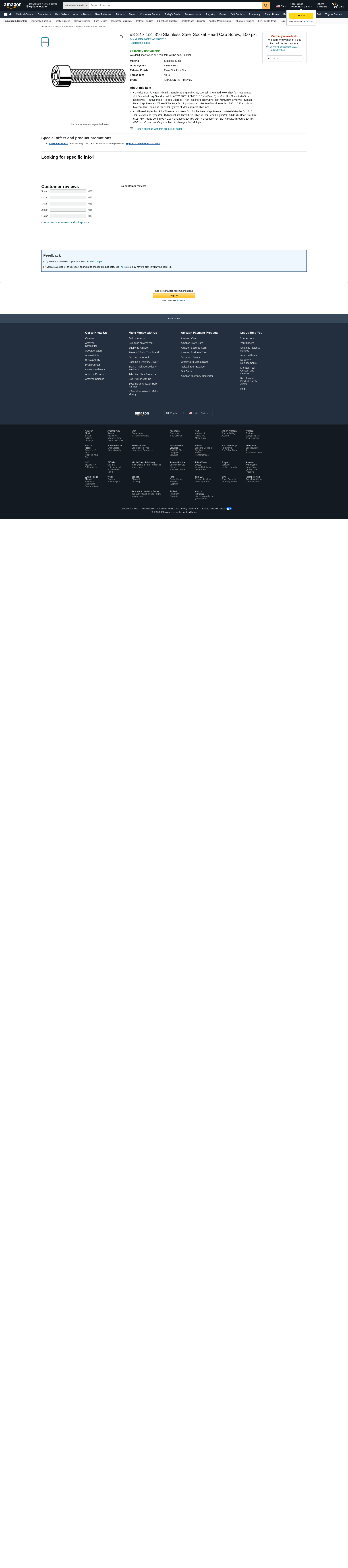 'Socket Head Cap Screw, System of Measurement Inch, Cylindrical, Basic Material Stainless Steel, Material Grade 316, #8-32, Length 1/2 In., Fastener Finish Plain, Fastener Thread Type UNC, Drive Type Hex Socket, Drive Size 9/64 In., Thread Style Fully Threaded, Thread Direction Right Hand, Thread Length 1/2 In., Head Height 5/64 In., Thread Dia. #8, Package Quantity 100'