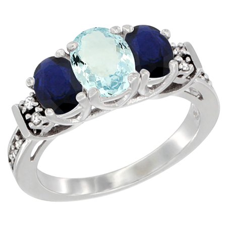 10K White Gold Natural Aquamarine & Blue Sapphire Ring 3-Stone Oval Diamond Accent