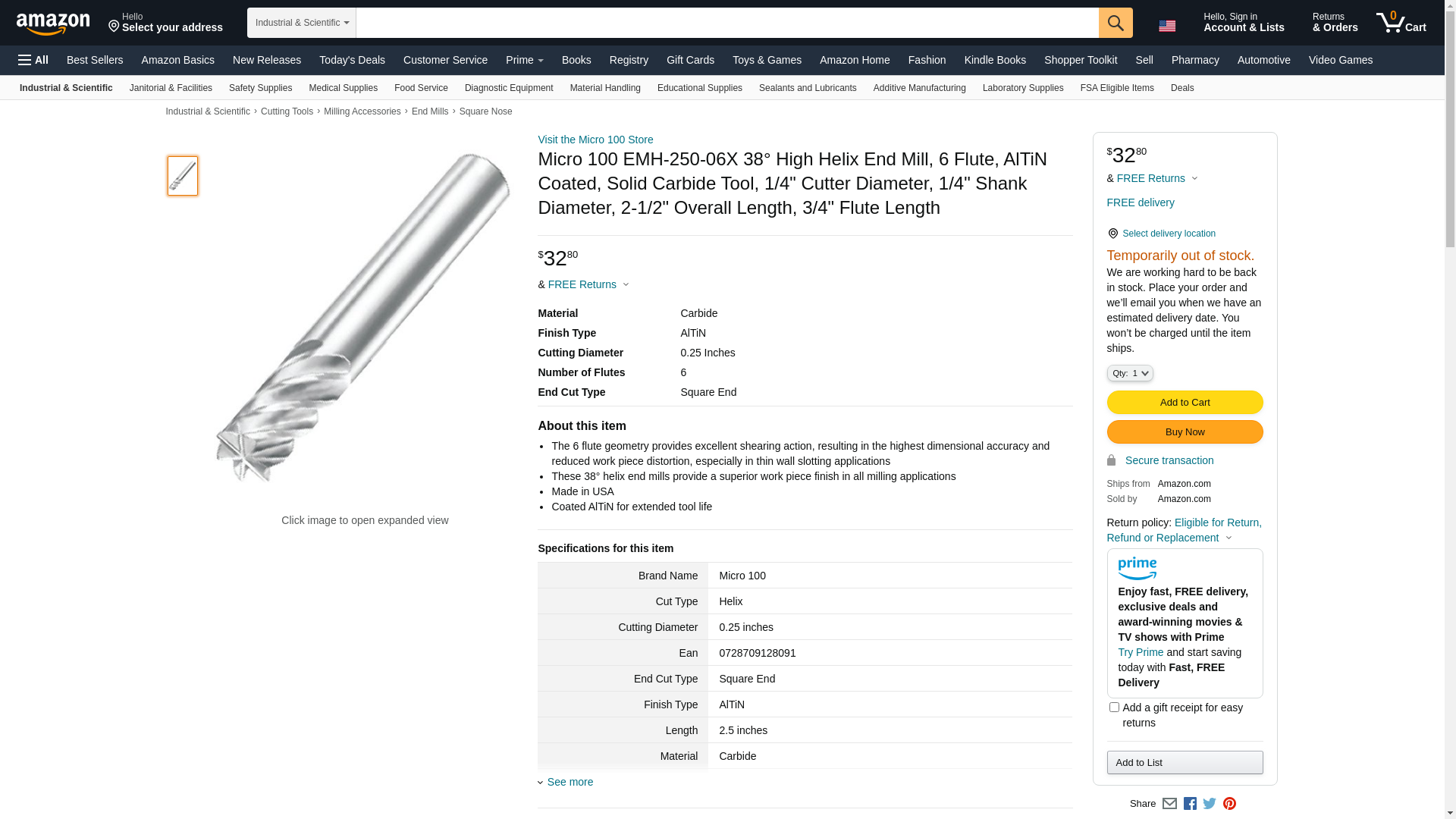 Micro 100 EMH-250-06X 38° High Helix End Mill, 6 Flute, AlTiN Coated, Solid Carbide Tool, 1/4" Cutter Diameter, 1/4" Shank Diameter, 2-1/2" Overall Length, 3/4" Flute Length