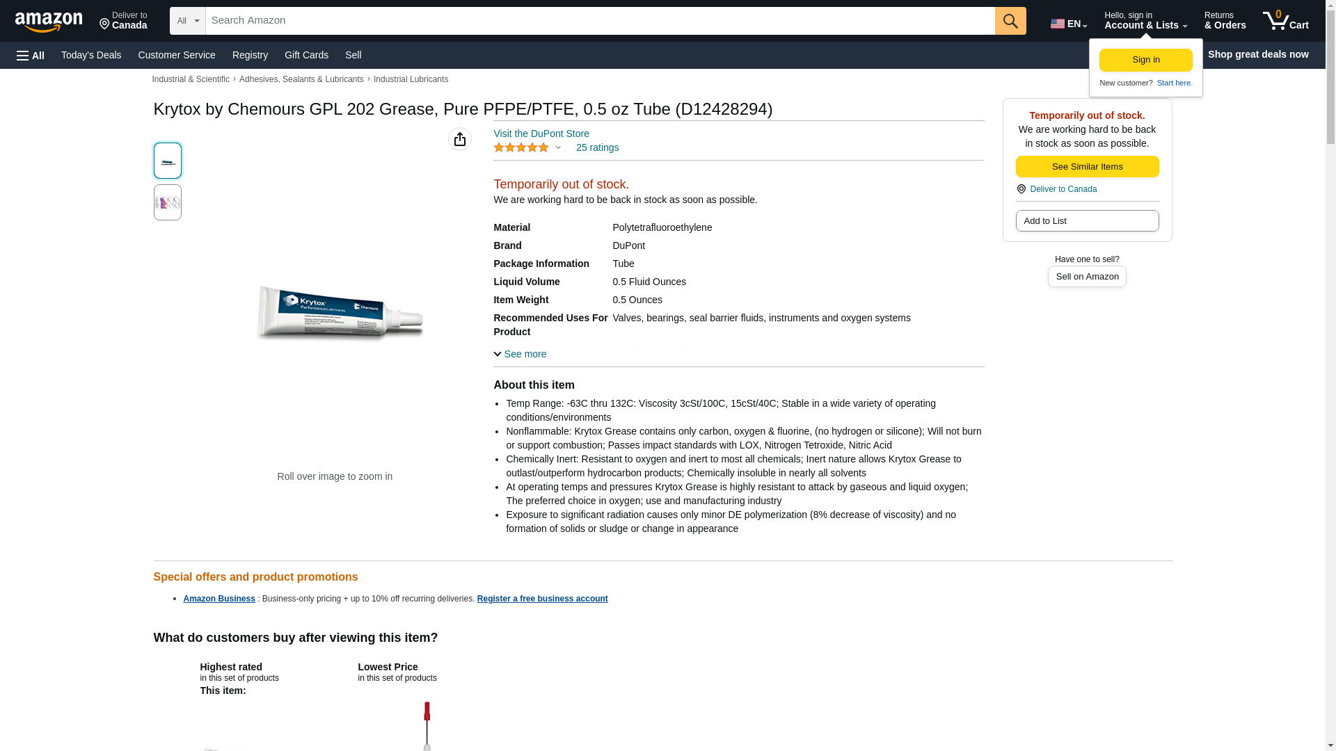 DuPont Krytox GPL 202 Grease, Pure PFPE / PTFE No Additives, 0.5 oz Tube. Temp Range: -63C thru 132C: Viscosity 3cSt/...