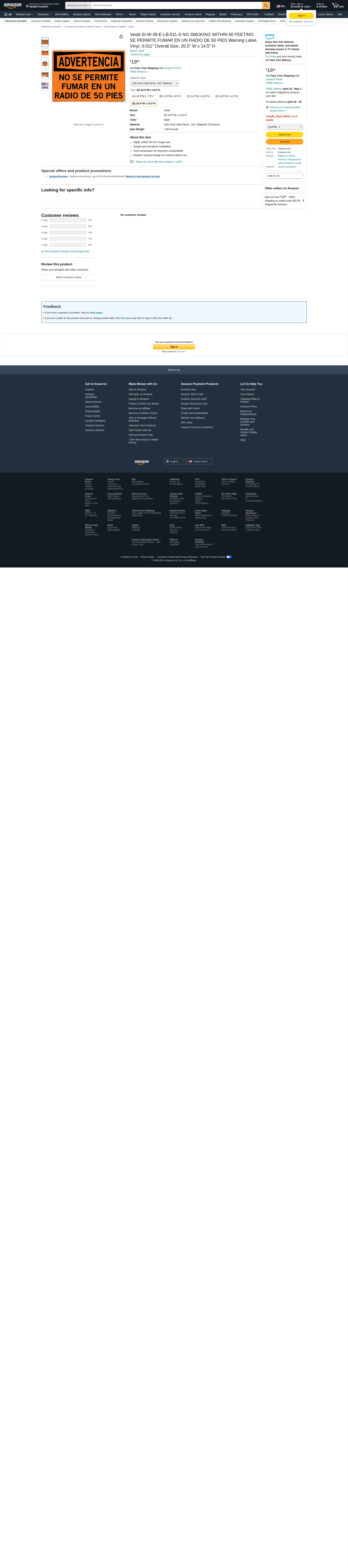 Vestil SI-W-39-E-LB-011-S NO SMOKING WITHIN 50 FEET/NO SE PERMITE FUMAR EN UN RADIO DE 50 PIES Warning Label, Vinyl, 0.011" Overall Size, 20.5" W x 14.5" H