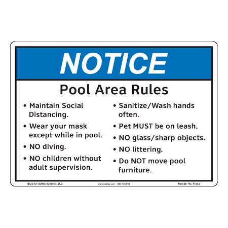 <p><strong>Word Message:</strong></p> <p>Pool Area Rules:<br />*Maintain Social Distancing.<br />*Wear your Mask except while in pool.<br />*NO diving.<br />*NO children without adult supervision.<br />*Sanitize/Wash hands often.<br />*Pet MUST be on leash.<br />*NO glass/sharp objects.<br />*NO littering.<br />*Do NOT move pool furniture.</p> <p><strong>Description: </strong><br />Clarion Safety Systems brings you high quality Notice/Pool Area Rules signs (Item# F1383-) which are produced on premium plastic, aluminum, and polyester materials and are expertly designed to meet your safety sign needs.</p><p><strong>Material Information:</strong></p> <ul> <li><strong>Material</strong>: (BJ) Indoor/Outdoor Plastic</li> <li><strong>Base Materials</strong>: .060" Rigid White Plastic</li> <li><strong>Overlaminate</strong>: none</li> <li><strong>Mounting Option</strong>: Mounting holes</li> <li><strong>Application</strong>: Indoor/Outdoor</li> <li><strong>MaxTemp</strong> (F): 140</li> <li><strong>MinTemp</strong> (F): 32</li> <li><strong>Chemical Resistance</strong>: Good</li> <li><strong>UV Resistance</strong>: Good</li> <li><strong>Outdoor durability</strong>: Good</li> <li><strong>Expected Life Indoor</strong>: Long term</li> <li><strong>Expected Life Outdoor</strong>: 3-5 year (expected outdoor life may vary due to climatic conditions)</li> </ul>