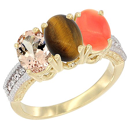 14K Yellow Gold Natural Morganite, Tiger Eye & Coral Ring 3-Stone Oval 7x5 mm Diamond Accent, sizes 5 - 10