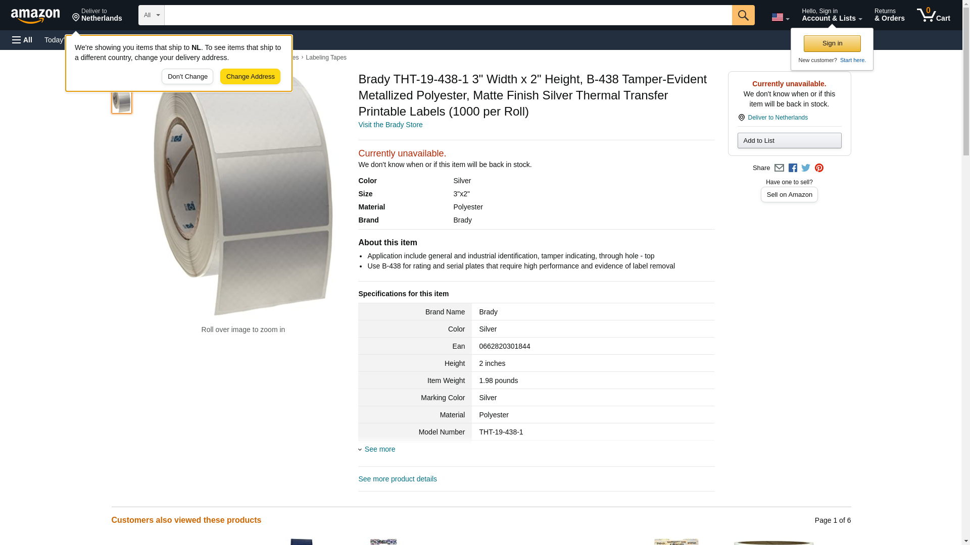 Brady THT-19-438-1 3" Width x 2" Height, B-438 Tamper-Evident Metallized Polyester, Matte Finish Silver Thermal Transfer Printable Labels (1000 per Roll)
