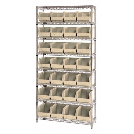 Quantum Storage Systems WR8-239IV 8-Tier Complete Wire Shelving System with 28 QUS239 Ivory Giant Open Hopper Bins, Chrome Finish, 12" Width x 36" Length x 74" Height