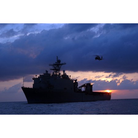 LAMINATED POSTER An SH-60B conducts an early morning fly-by of the amphibious dock landing ship USS Oak Hill (LSD 51) Poster Print 24 x 36