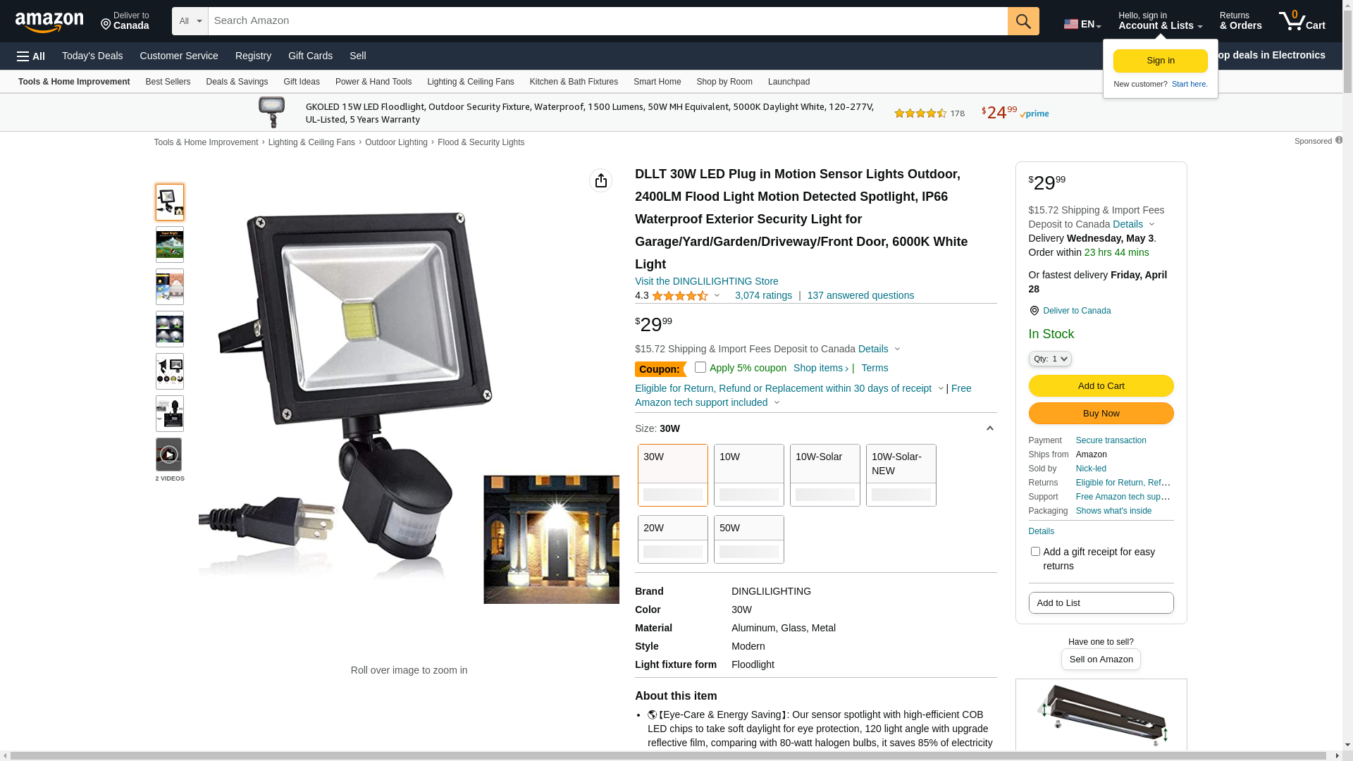 <b>Choose us is choose safety with high quality and reasonable cheaper price:</b><br>1.Factory sales,the assurance of quality,economic and affordable.Don't need to worry about the lamp stop working in short time then waste your money.<br>2.Let the easy-to-install sensor light illuminate your garden if there are other people or animal visiting your home.<br>3.Let the fantastic brightness to lighting up your doorway notify your family that you are go home now.<br><b>We have 10W/20W/30W/50W for you choose(Just click size name to find other model)</b><br><br><b>NOTE:</b>These lights will not lighting all the time,only lighting when the sensor <br>detects people or animals. when you switch to"SUN",sensor will detects people or animals<br> for all 24 hrs;when you switch toâMOON'the sensor will detects<br> people or animals only at night<br><br><b>Specifications:</b><br>Light Type:Super Bright COB LED chips<br>Input Voltage: 85-265V/50~60Hz (perfect work at 110V &120V) <br>Color Rendering Index (CRI>):80<br>Color Temperature: 6000K-6500K Daylight White <br>Working Temperature: -30âď˝45â <br>Luminous Flux: 4000LM <br>Beam Angle:120 degree <br>Projection Distance: up to 15m/49ft <br>Sensor range: up to 12m/40ft <br>Lead cable length: 59â/1.5m <br><br><b>Energy Saving and Environment-friendly product</b><br>Replace traditional 240W halogen bulb by 30W LED to achieve the same lighting.<br>Save 85% on electricity bill,no bulb changed frequency.<br>No radiation, no lead,mercury and other pollution elements.<br><br><b>Smart and sensitive detector Settings:</b><br>"LUX"--switch to"SUN",sensor works all 24 hrs;to"MOON" the sensor works only at night or dark place.<br>"TIME"--set the light duration time, from 5 seconds to 2 minutes.<br>"SENS"--adjust the sensor's sensitivity to movement Detection distance: up to 12m(40 feet),Detection <br>range: 180 twist-able up and down,left and right.