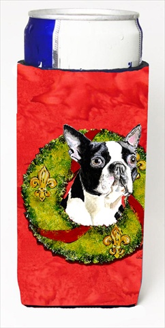 Caroline's Treasures SC9097MUK Boston Terrier Christmas Wreath Ultra Hugger for slim cans Can Cooler Sleeve Hugger Machine Washable Drink Sleeve Hugger Collapsible Insulator Beverage Insulated Holder