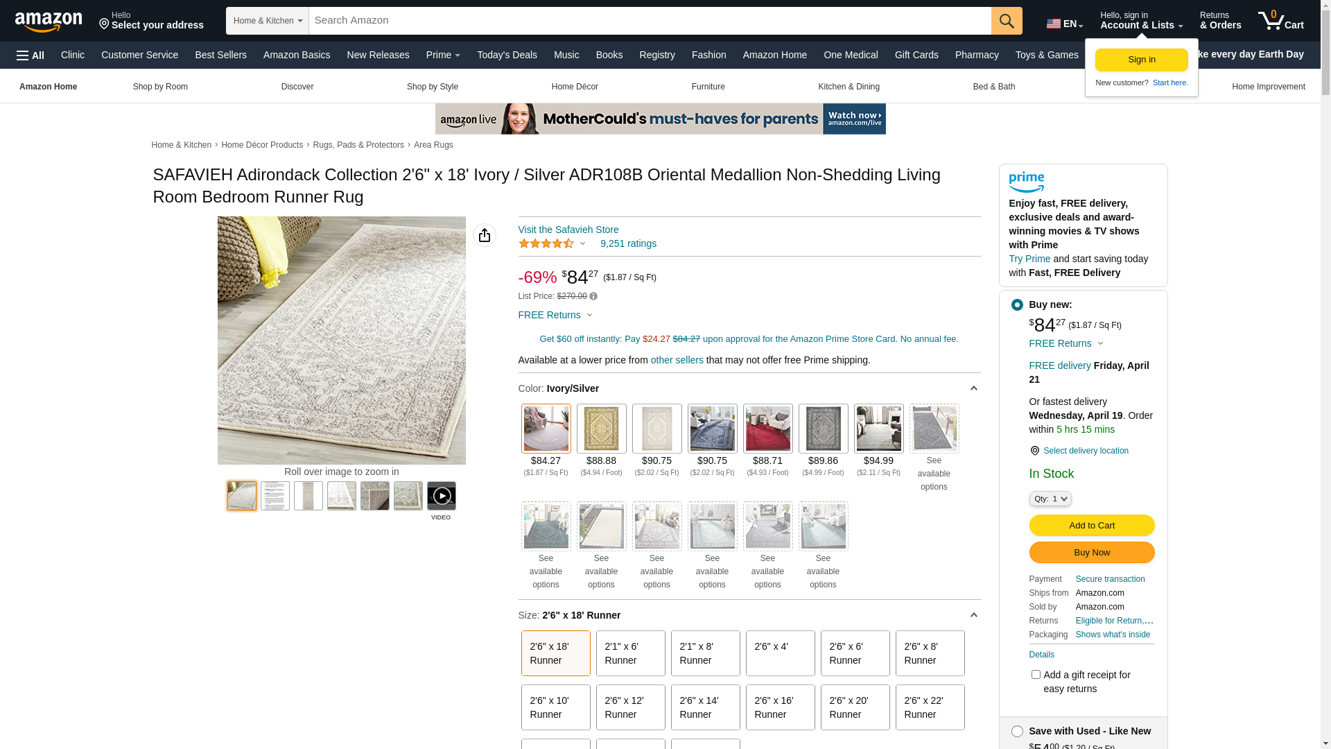 Safavieh ADR108B-218 2 ft.-6 in. x 18 ft. Adirondack Power Loomed Runner Rug, Ivory & Silver