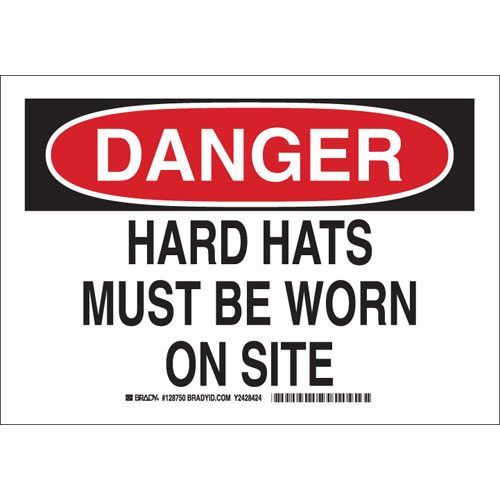 Brady 128750 DANGER Hard Hats Must Be Worn On Site Sign - Self-sticking Polyester - Black/Red on White - 7 x 10